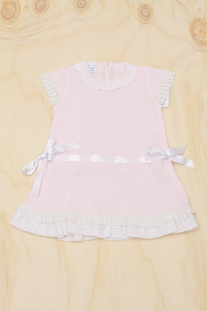 Pasaliston a la cadera con moño en cada lateral, doble orilla en la falda, primera en gris y la segunda, blanca con puntos.