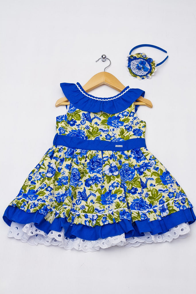 Hermoso vestido estampado de flores con detalle en el cuello de banda plisada y ondas. Banda azul a la cintura y en la falda doble orilla de color azul y encaje.
