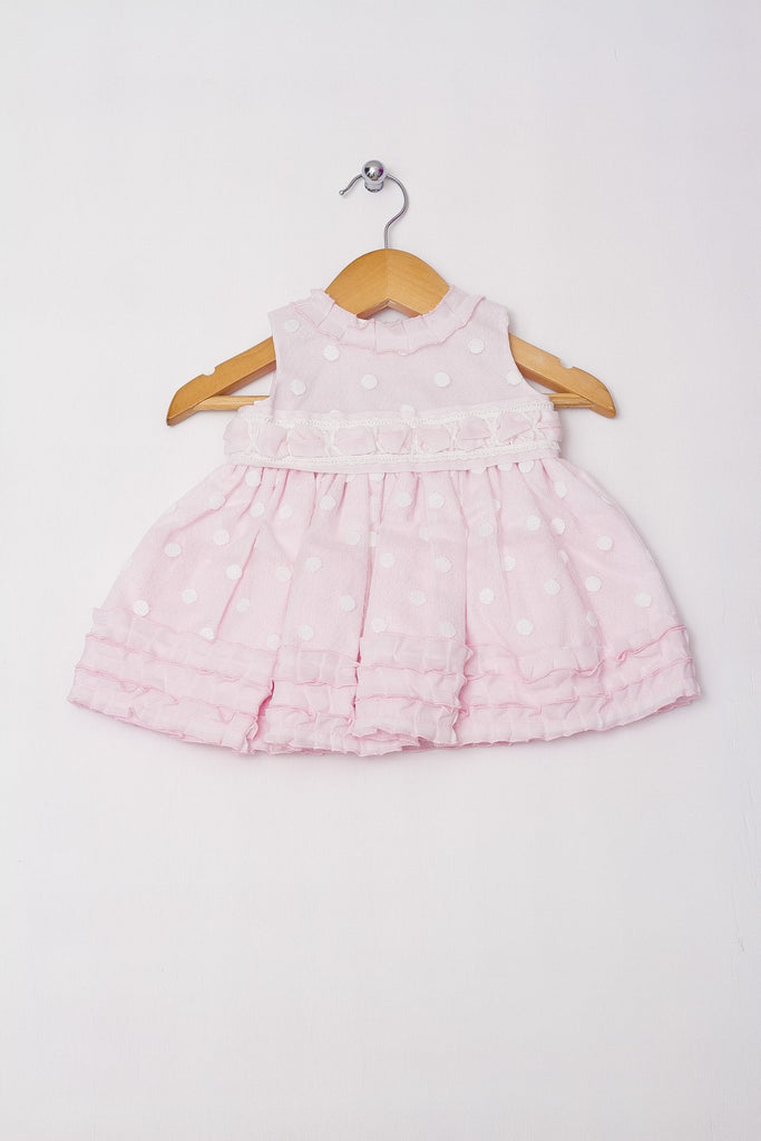 Vestido sisado de peto corto con tela exterior de organza y detalle de lunares. Fino detalle de tejido en el peto. Olán rizado en el cuello y orilla de la falda. Tela: algodón.