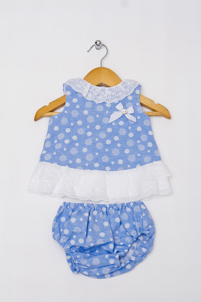Conjunto de vestido y calzón, con detalle de encaje en el cuello, orilla de doble encaje, lazo en el pecho y tela con estampado. Calzón de elástico en la cintura y piernas.