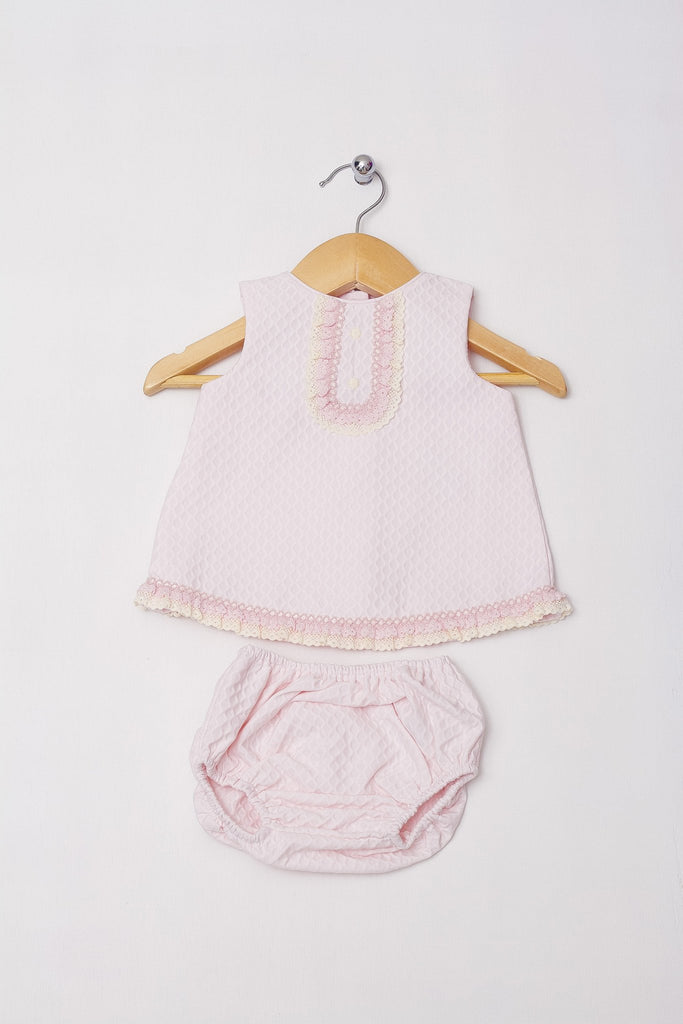 Hermoso conjunto de algodón grueso texturizado con fino detalle de encaje en el pecho y en la orilla del vestido. Incluye calzón. Dato a mamás: El vestido llega a la cadera quedando el calzón expuesto. Tela: algodón y poliéster.