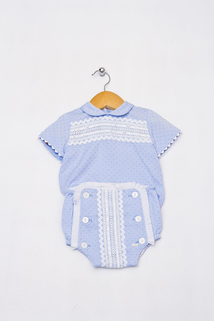 Conjunto con estampado de bolitas. Detalle con ondas en las mangas, encaje de ondas y pasalistón en el frente de la camisa. Calzón con 6 botones, encaje de ondas y pasalistón al frente y listón sisado.
