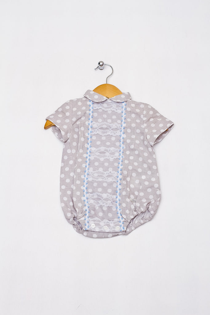 Fino mameluco de lino con encaje español y estampado color gris con lunares.