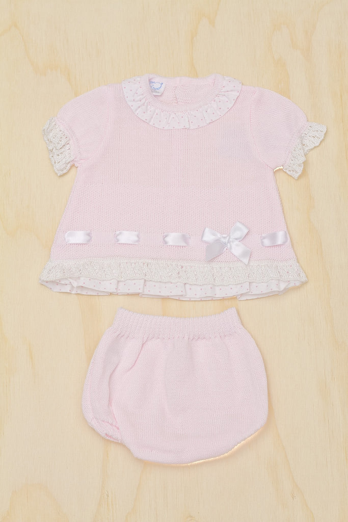 Conjunto de blusa con detalles de encaje en cuello y mangas, doble encaje en la orilla. Pasaliston con lazo al frente.