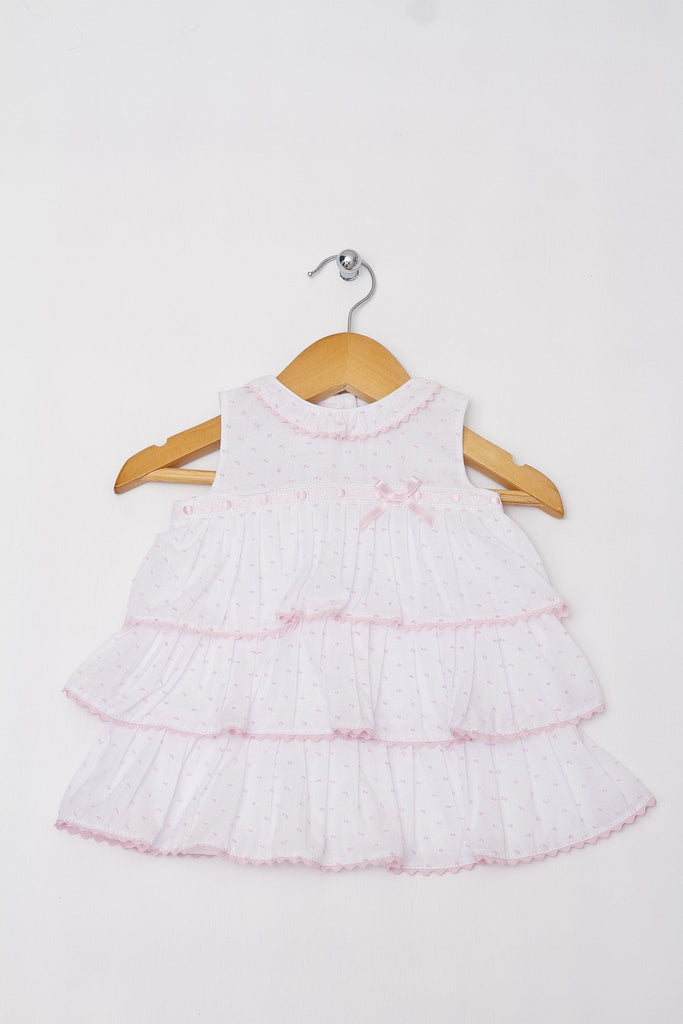 Coqueto vestido de algodón con acabado plumeti con 3 capas de olanes y trenzilla en la orilla.