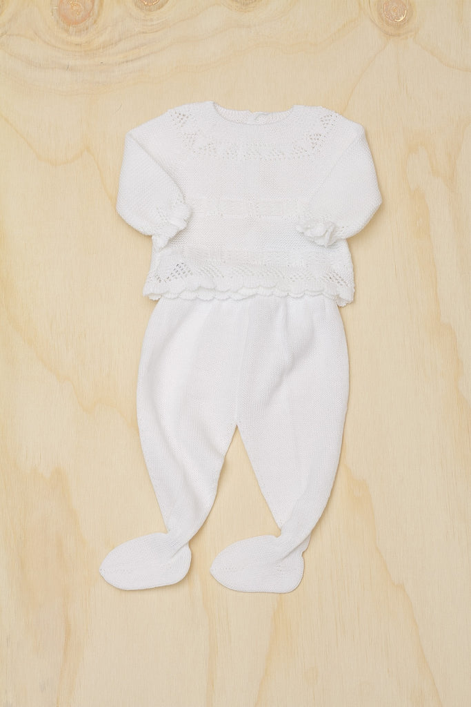Conjunto con calzón tipo polaina, camisa de manga larga, detalle caldo en cuello, mangas y orilla, doble pasaliston al frente.